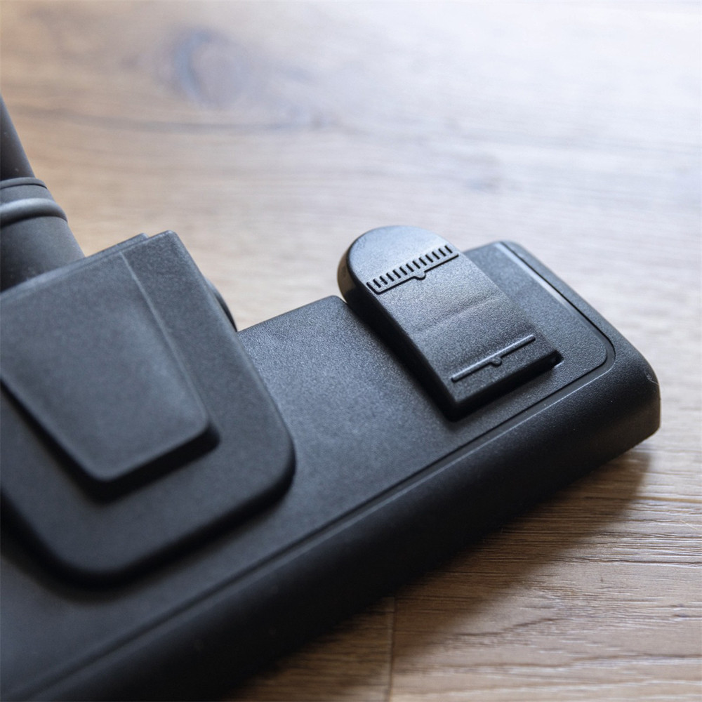 A nagy, 560 ml-es gyűjtőtartartály hosszabb munkát tesz lehetővé gyakori ürítésigény nélkül. A kompakt kialakítás a tárolás során is helyet takarít meg, amit tovább könnyít a beépített konzol is, ami segítségével a falra szerelhető. A porszívó három hosszabbítócsővel és egy padlószívóval van felszerelve, amivel kényelmesen tisztítható a padló is.