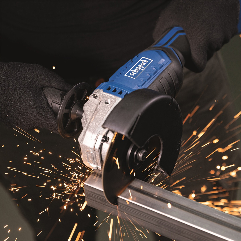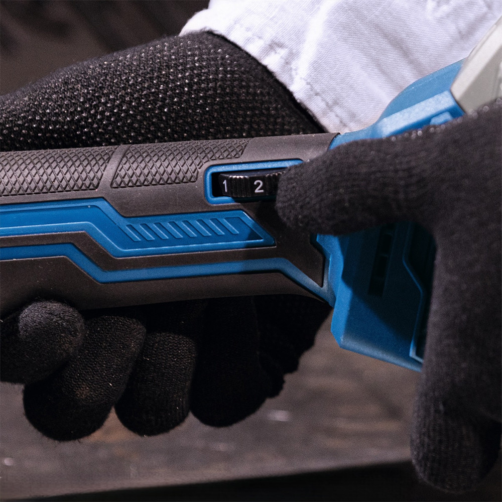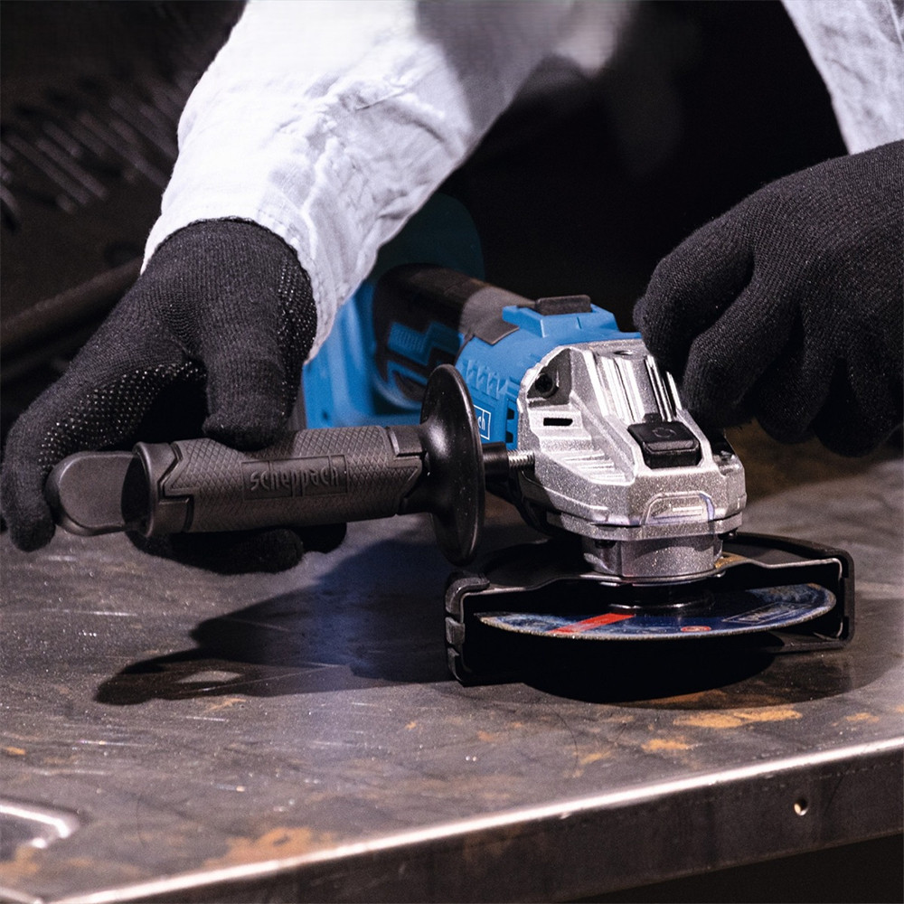 A munkabiztonságot fokozza a védőburkolat, amely szerszámhasználat nélkül is könnyen állítható. A csiszoló lehetővé teszi a fordulatszám hat fokozatban történő beállítását gombok segítségével 2500-10 000 ford./perc tartományban, ami garantálja az adott anyaghoz és alkalmazáshoz való pontos alkalmazkodást. Az oldalfogantyú három pozícióba állítható, és beépített rögzítőkulcstartóval van felszerelve, ami növeli a kényelmet és a meggyorsítja a tárcsacserét.