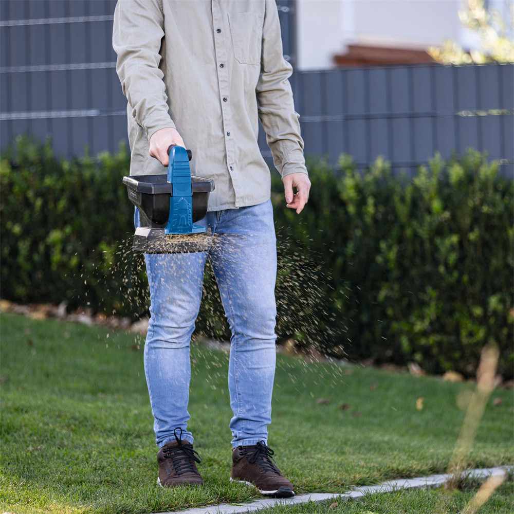 A szóró gondoskodik az anyag egyenletes eloszlásáról különböző típusú felületeken, legyen szó gyepről, hóról vagy talajról. A nagy, 3,5 literes tartály töltésenként akár 800 m²-es területet szórását is lehetővé teszi. A kiszórandó anyag mennyisége 8 fokozatban állítható.