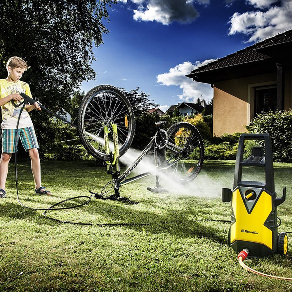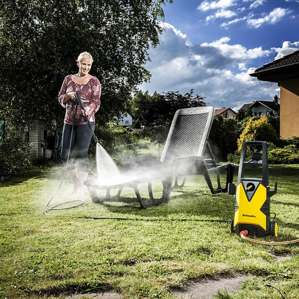 Beépített tartozéktartó a nagynyomású szórópisztoly és szórószár részére, tömlőtartó. Tartozékok gyorscsatlakozós, nagynyomású szórópisztoly, szórószár forgatható fúvókával, szórószár rotációs turbófúvókával, magasnyomású tömlő 5m, elektromos kábel 5m, átlátszó vízszűrő, 0,5 l mosószertartály habosító fúvókával.